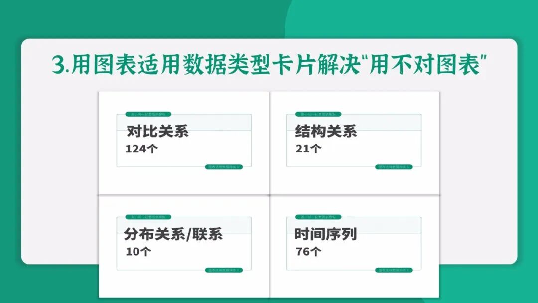 确定好数据关系,然后去对应的数据类型卡片中挑选,当数据关系和图表表达关系一致时,您的图表就用对了。