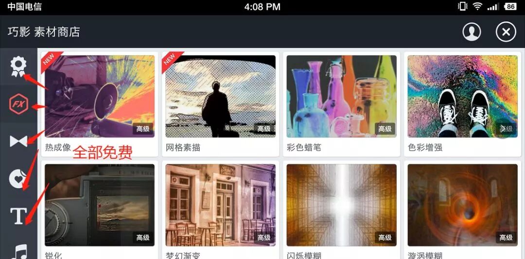 APP商城里面的所有:图片模板、图片特效、转场特效、视频滤镜、所有字体、在线音乐、音乐特效。都是免费试用的。这点比PR还实用。