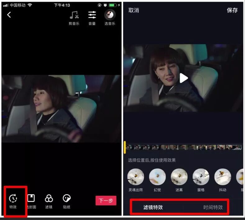 点击视频左下角的特效,有两个选择,一个是滤镜特效,另一个是时间特效。