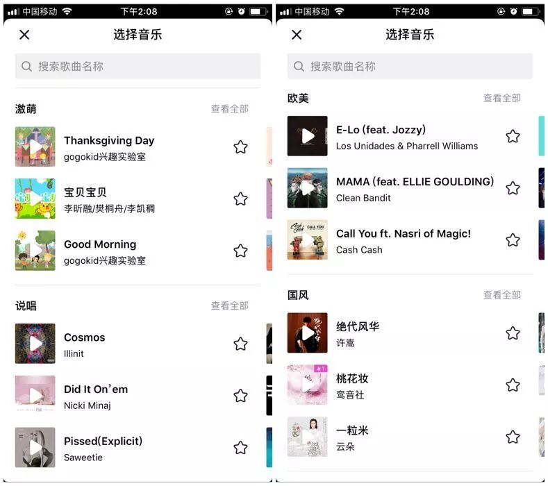 有十几种分类,包括欧美、激萌、搞怪、日韩、舞蹈、校园、运动、经典、配乐等,可根据自己拍摄的内容来选择。另外,我们还可以在搜索栏中搜索自己喜欢的歌曲。