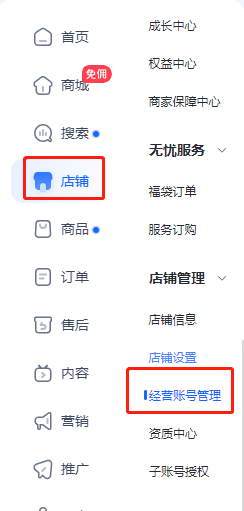 打开店铺后台,在店铺板块内,点击账号经营管理,绑定店铺的官方账号。