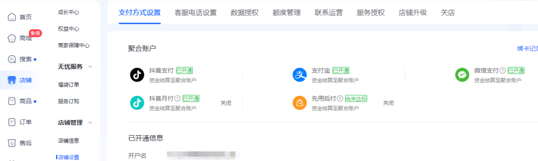 点击店铺设置,在支付方式中把四个货款账户都开通好。