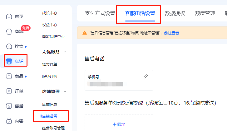 点击店铺设置,在客服设置中把客服电话填写一下。