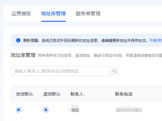 同样在物流工具的页面,点击地址库管理,新建一个默认发货和默认退货的地址,写成你自己的真实地址就可以了。