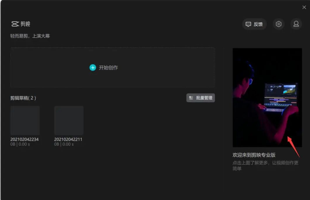 打开剪映PC版,界面如下。这个界面就如同其他软件的启动欢迎界面一样。需要提醒的就是点击右边的图片,可以打开剪映官网。