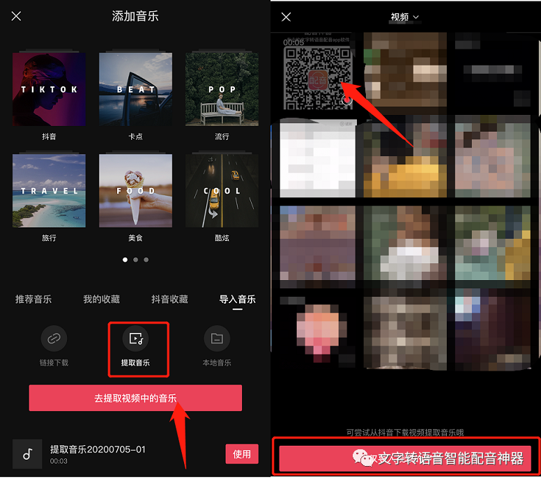 2、在导入音乐中,选择音频,点击去提取视频中的音乐,
