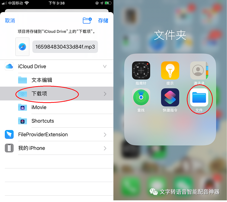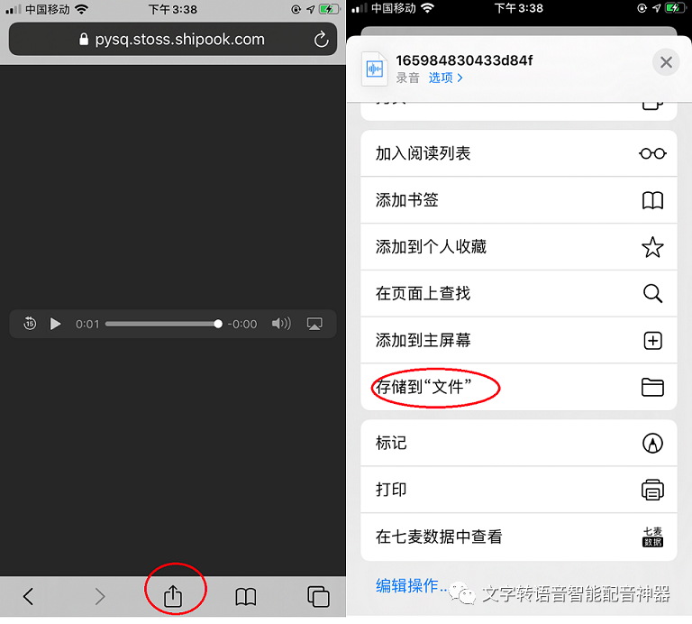 2、苹果手机,复制配音MP3下载链接,到浏览器中粘贴前往,下载选择存储到文本