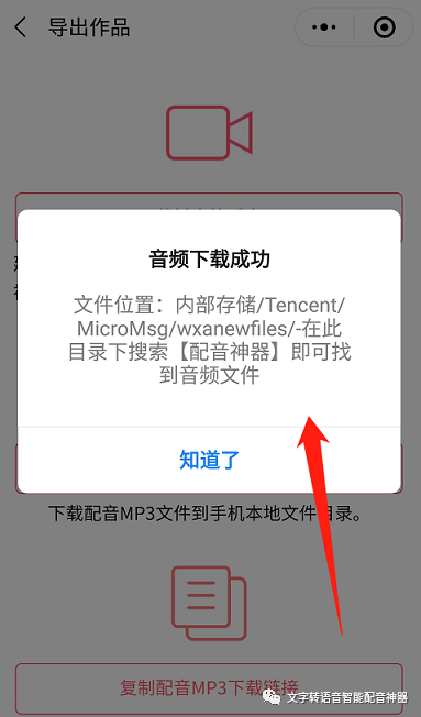直接保存到内部储存/Tencent/MicroMsg/wxanewfiles/-在此目录下搜索(配音神器)即可找到音频文件。