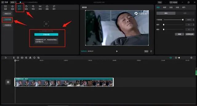 当我们对视频进行分割操作之后,留下自己需要的片段之后,下一步就是要是要给这个电视剧片段素材添加字幕,而添加字幕的方法也比较简单,直接点击软件左上角的文本,然后选择识别字幕,如下图: