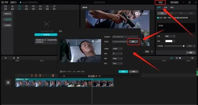 当我们将导入的素材剪辑成自己需要的片段以后,又使用识别字幕功能添加了字幕,同时又根据自己的需求添加了各种特效以后,那么下一步要做的就是导出视频。如下图: