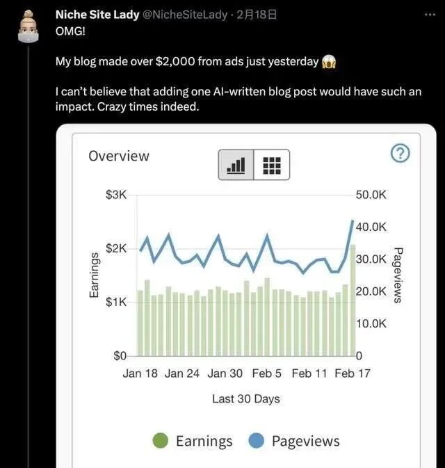 比如前阵子某位海外博主,用ChatGPT写了一篇文章 日赚14000元的案例。