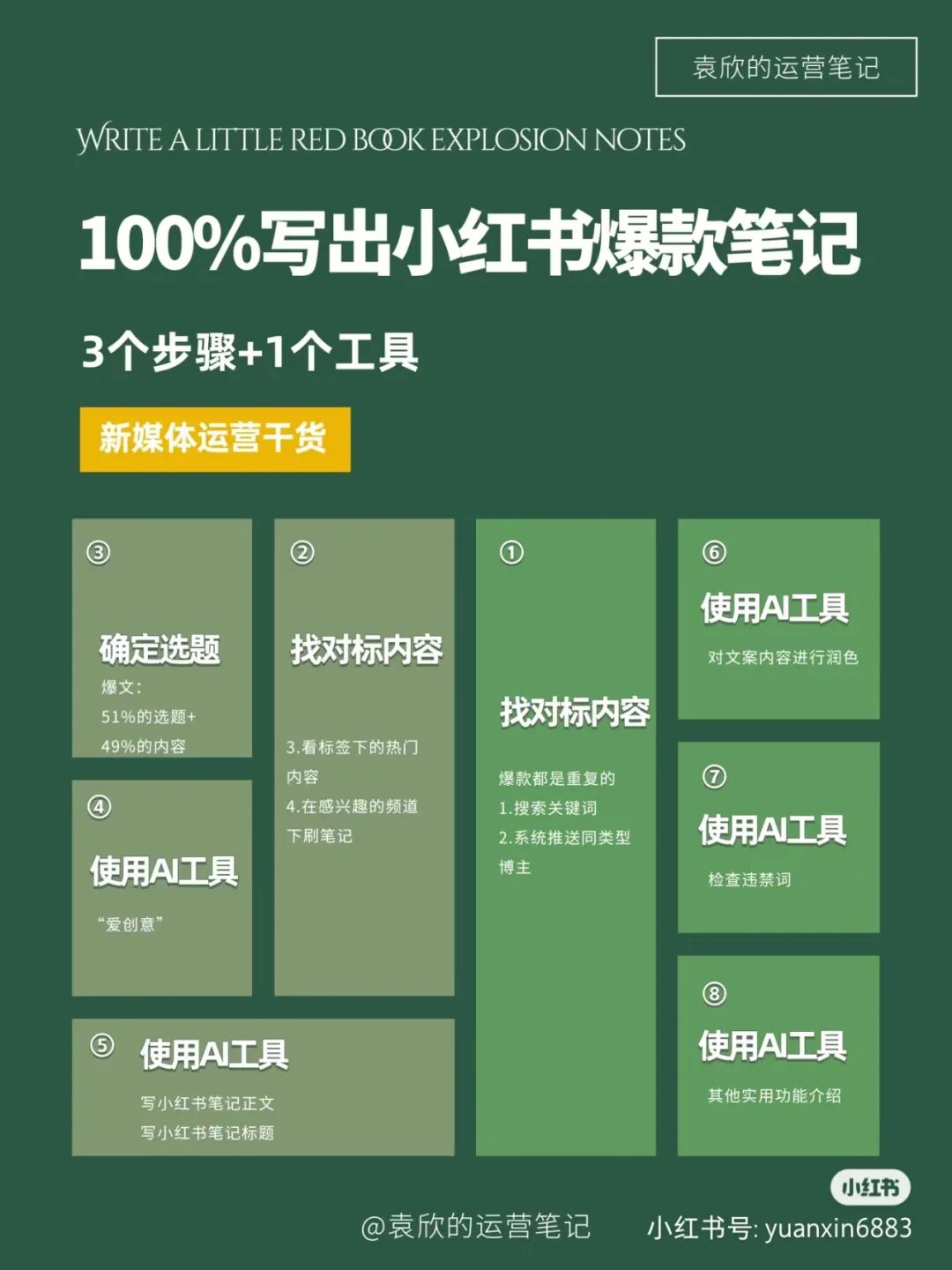 比如袁欣的运营笔记中,提出的3个步骤+1个工具的小红书笔记输出结构,就可以利用AI工具,从确定选题到内容输出,全部由AI辅助或自主完成。