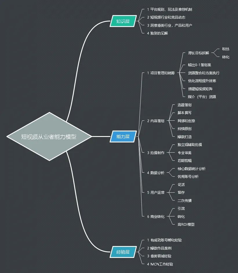 在既往工作经验的基础上,翻阅了一些招聘JD,总结出了一份<短视频从业者能力模型>(下图)。
