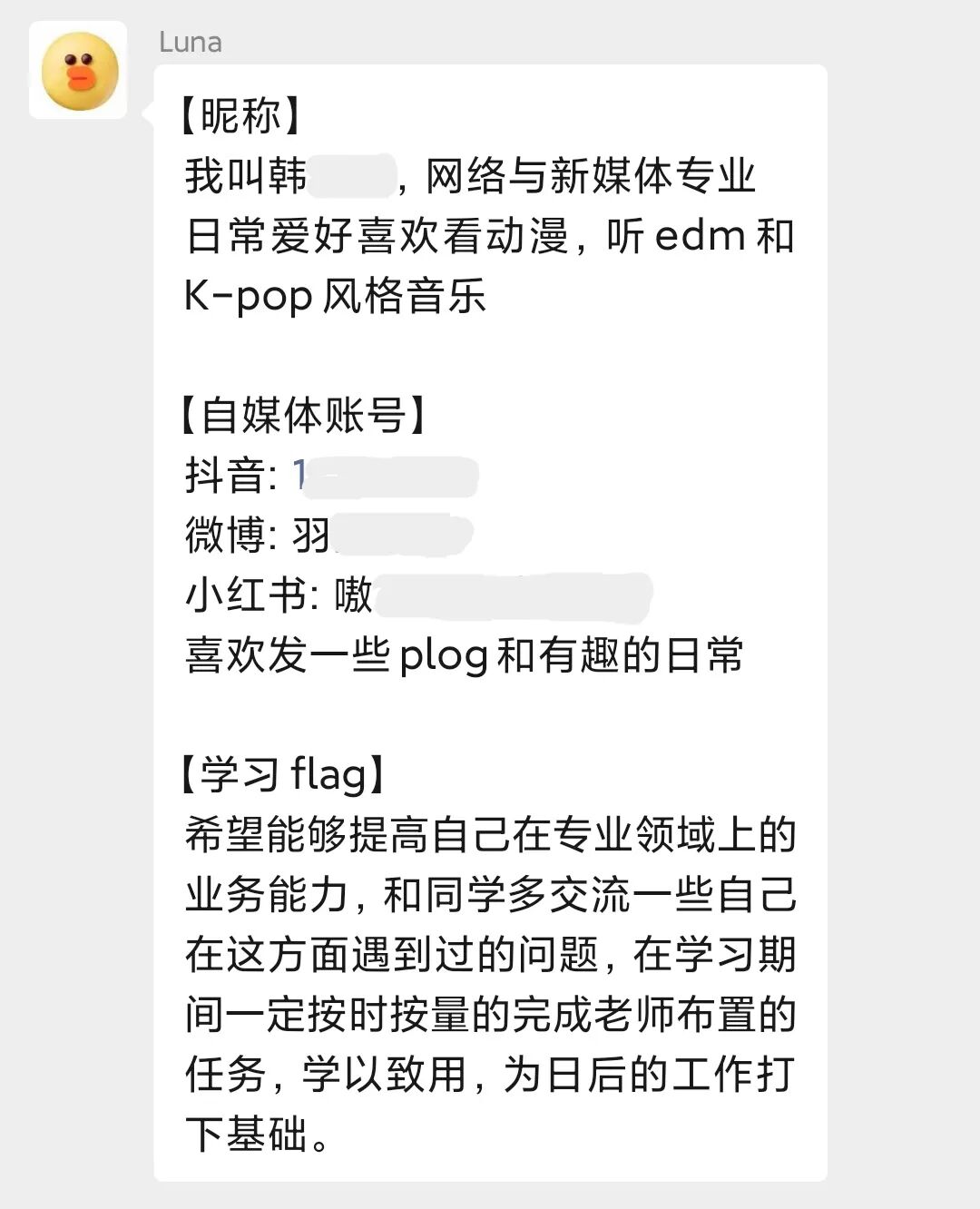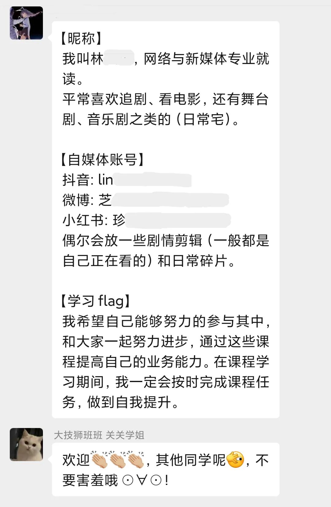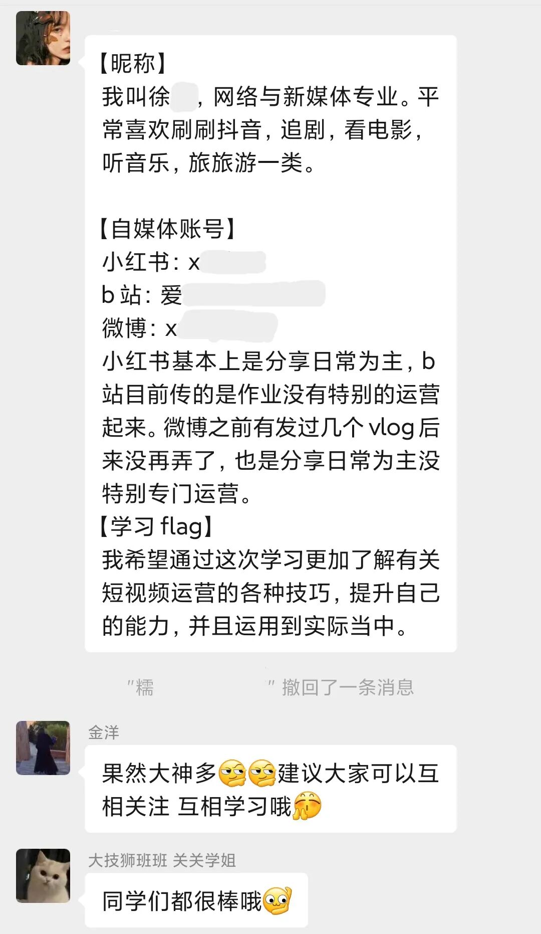我希望能够增强自己短视频内容的塑造,接触更多的技能,也能聆听更多的前辈经验,并与未来就业和职场产生更加紧密的联系。