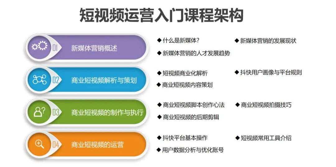 短视频运营入门训练营的课程中,其课程架构是更加贴近刚刚入门短视频运营岗位的职场新人。我们通过岗位入门由浅入深地一步步引导学习,帮助大家减少刚刚入门的迷茫,尽快为大家树立起岗位职责与职业目标。同时,缩短从学习到步入职场的过渡过程,贴近商业短视频营销,达到紧扣数字化转型的发展趋势、紧贴企业相关岗位要求的目的。