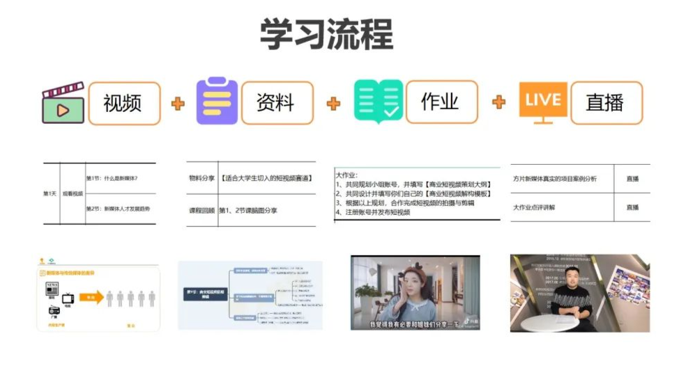 本课程因内容量密集,学习时间较短,只需7天,共一周的时间。其中共包括视频、资料、作业、直播四个方面。