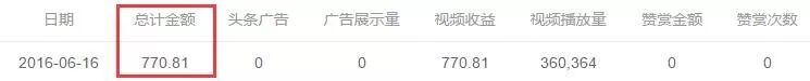 上面这个内容是我们在今日头条上发的1个原创视频,写这篇文章的时候播放量已经是65万了,当时发出的第二天可能在30万左右。来看一下我们那一天在今日头条获得的收入: