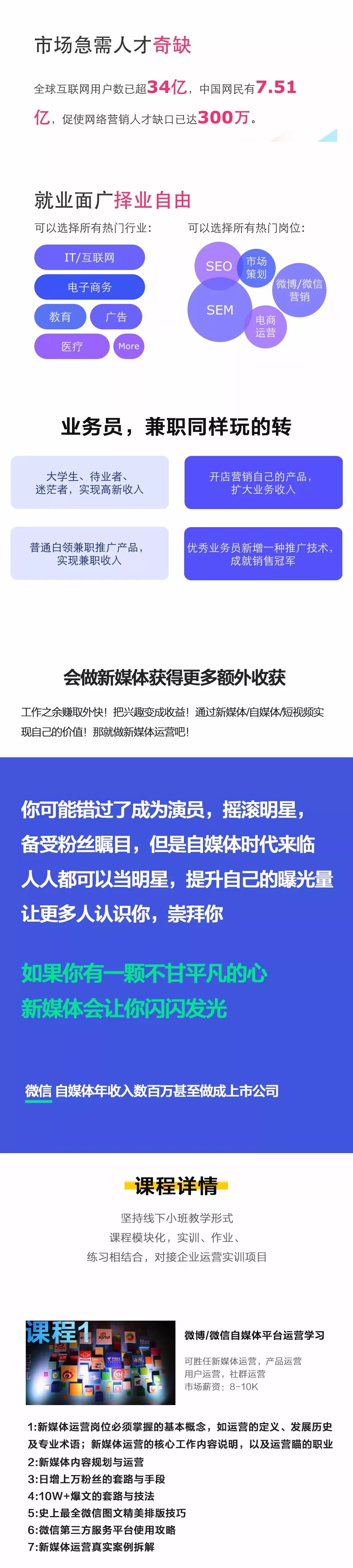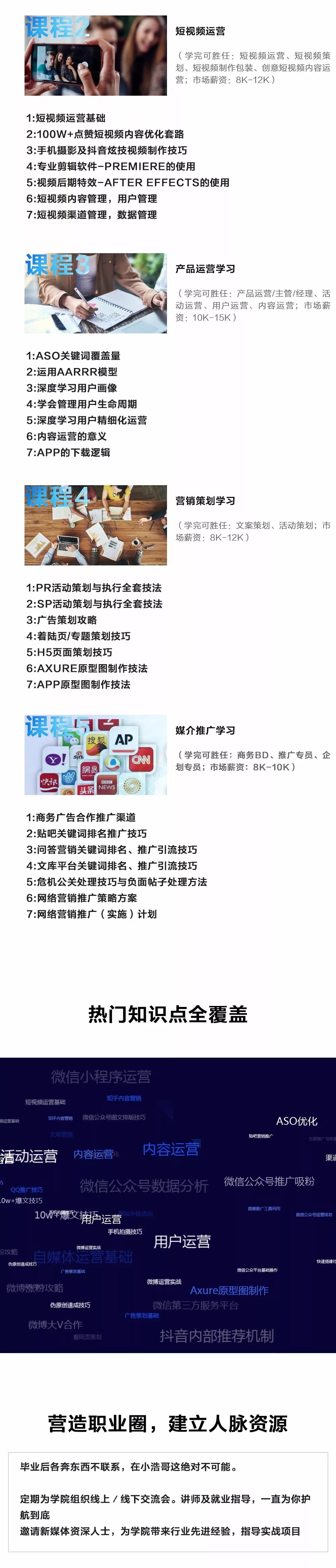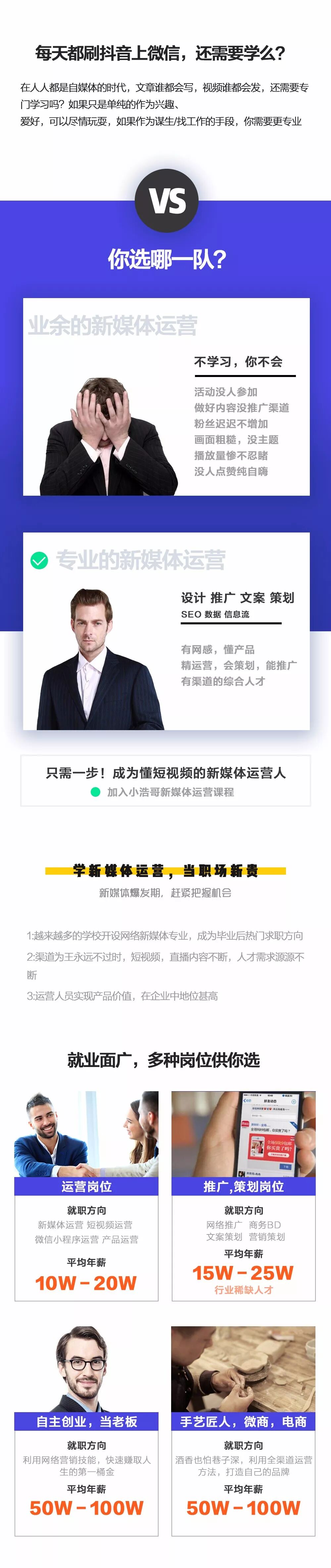 从2018年3月份,小浩哥就跟我说过不止一次,有很多同学对新媒体短视频很有兴趣,但是苦于没有经验深厚的资深人士领路路,想让我把这几年对新媒体运营这一行的经验,以及方法论总结出来,做成课程给同学分享一下,由于工作忙的缘故,一年来陆陆续续在将新媒体短视频运营的知识系统化,而且这个行业具备更新快的特性,16年是短视频,17年又来小程序,18年又出现社区电商,所以需要不断尝试总结丰富课程内容,最后今年在今年年初课程准备十分充分了,才推出给大家见面。有想不走弯路,短期,高效的就掌握新媒体短视频运营方法,顺利进入名企业工作的同学,可以来了解下这个包含了我5年来行业的真实经验的课程。你绝不会后悔!