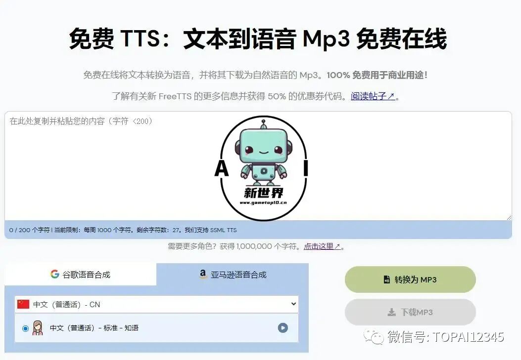 PS:以上两款服务都需要注册才能试用,如果不想注册,可以在 Free TTS 里体验,目前免费用户一次可输入 200 个字符进行体验,大家可以去试听一下效果。