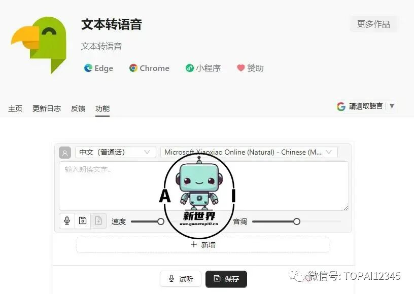 首先推荐大家使用国人开发的浏览器插件「文本转语音」,目前支持 Chrome 和 EDGE 浏览器,支持保存生成的语音。