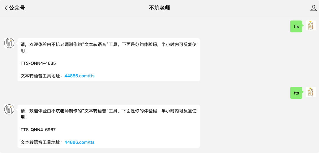你们在这个页面上每一次点击立即合成,我们都要向软件支付一笔费用。所以,这个工具不可能无限制地开放使用,目前只有给不坑老师公众号发送tts拿到体验码后才能使用。(每个关注者都能直接拿到,不是摇号)