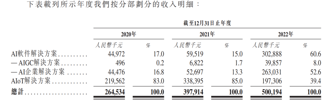 2020年-2022年(报告期),出门问问的收入中来自AIGC解决方案的收入分别为49.6万元、682.2万元、3985.7万元,占总收入的比例分别仅有0.2%、1.7%、8%。