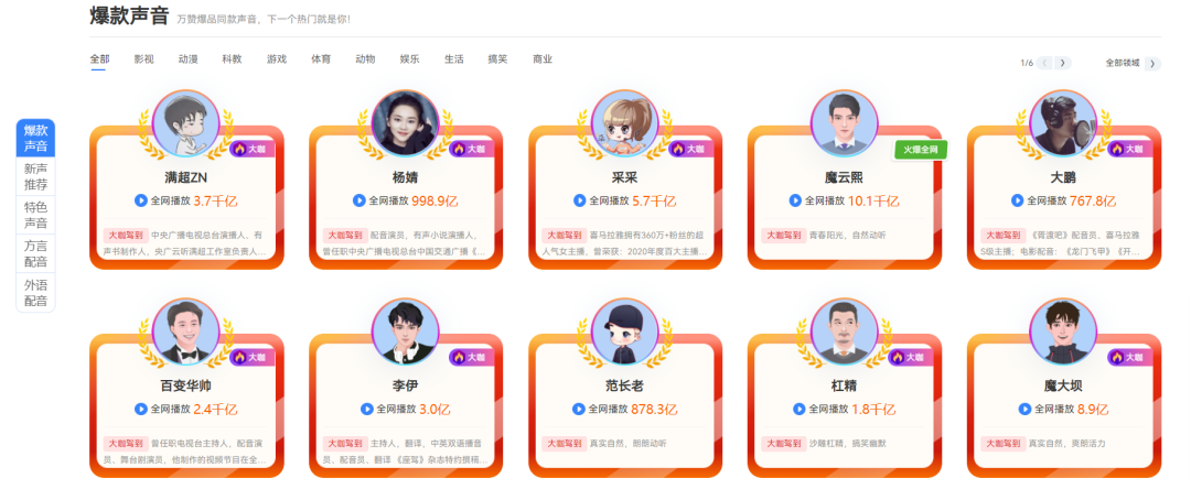 魔音工坊官网显示,平台最火爆的声音魔云熙,全网播放量已超1万亿,最近很火的陕西女声魔湘玉、港剧女声魔少芬、孙悟空魔悟空等声音,也都能在魔音工坊找到。