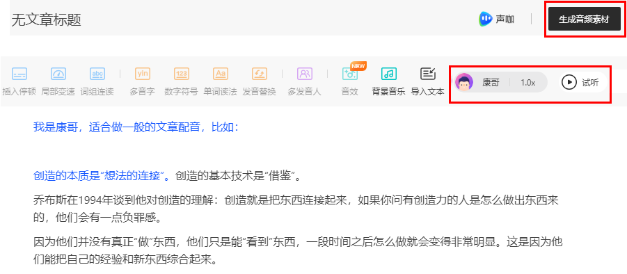 点击右上角的生成音频素材按钮