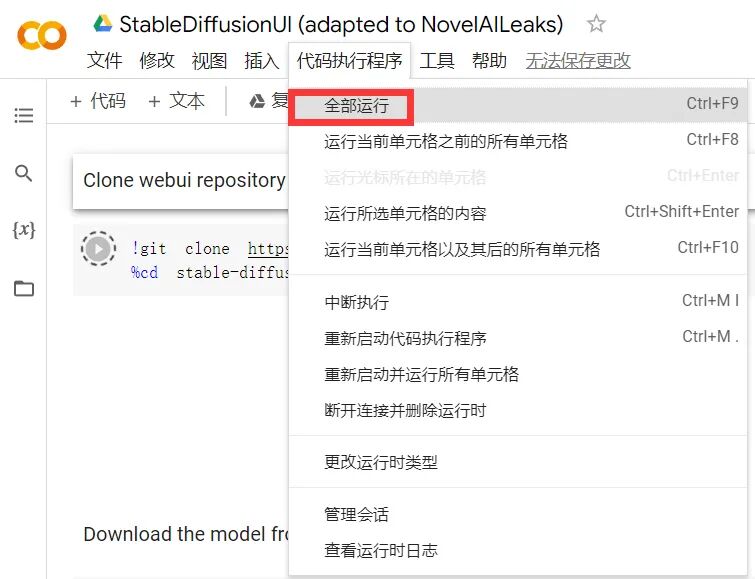 2.点击左上方菜单栏中的代码执行程序,并点击全部运行,会弹出一个警告,点击仍然运行(介意请勿操作)。