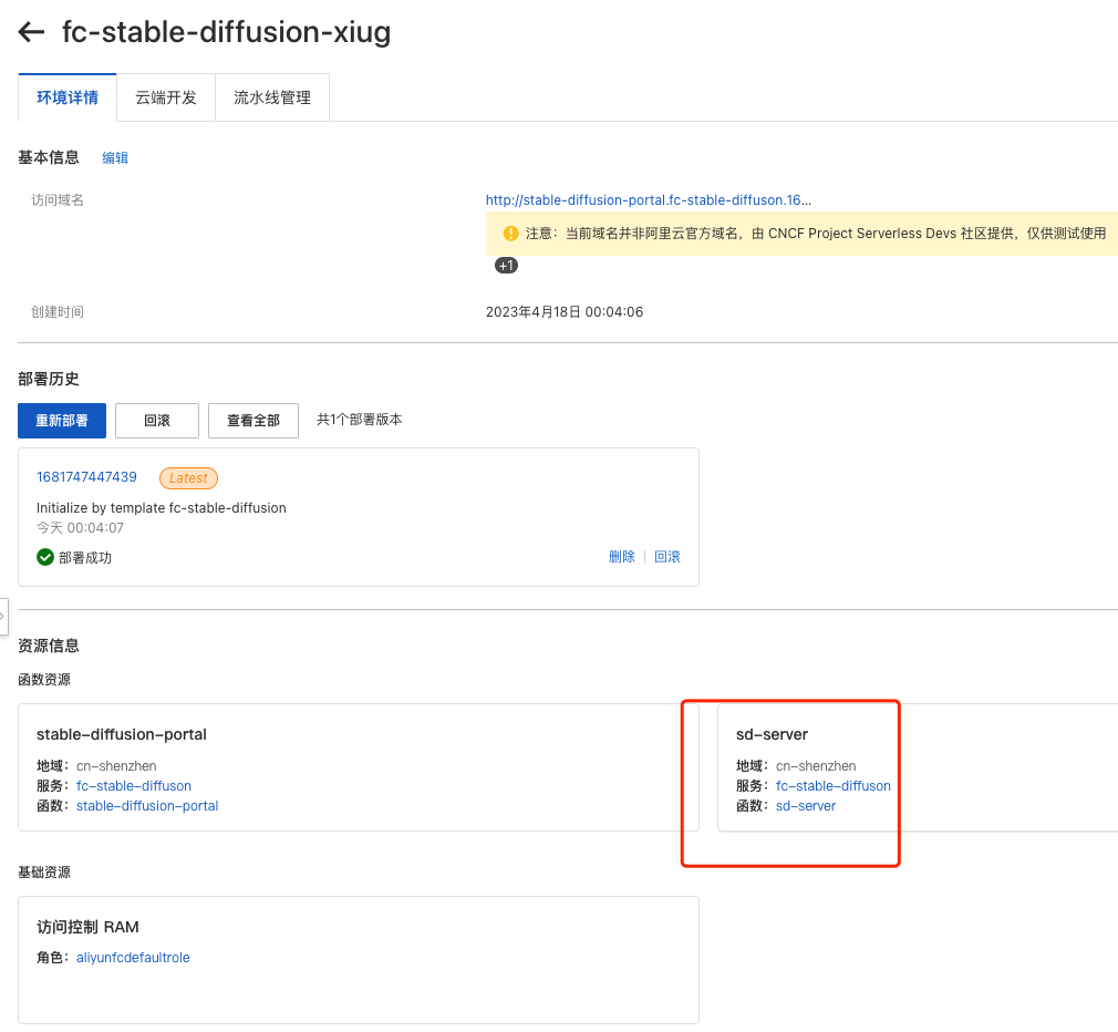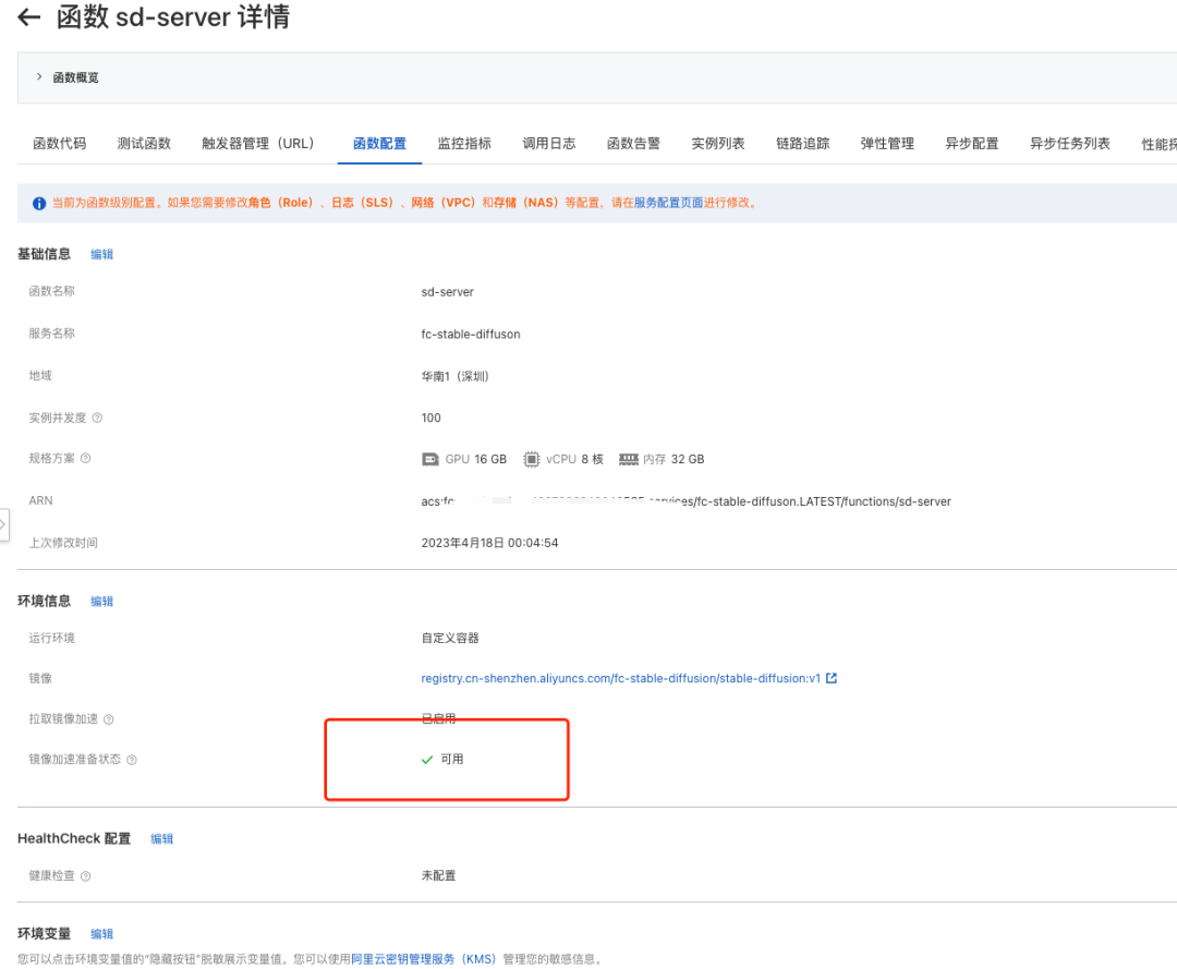 在函数sd-server详情页面的环境信息区域,检查镜像加速准备状态,请您耐心等待镜像加速准备状态变为可用。