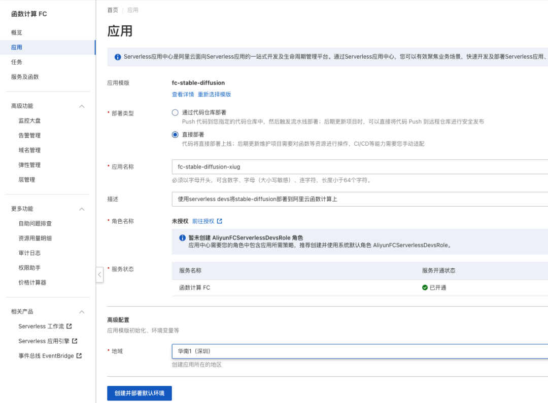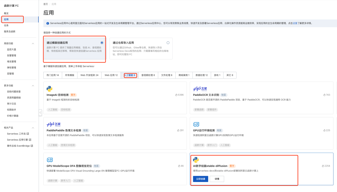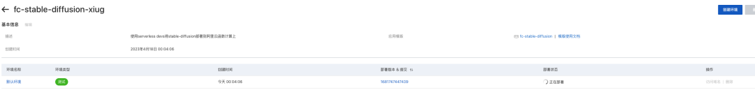 应用在选择部署方式的时候选择直接部署,里面就会有标准版的Stable Diffusion,当然你需要运行你优化或者修改过的版本,你可以让他直接部署你这git上面的版本