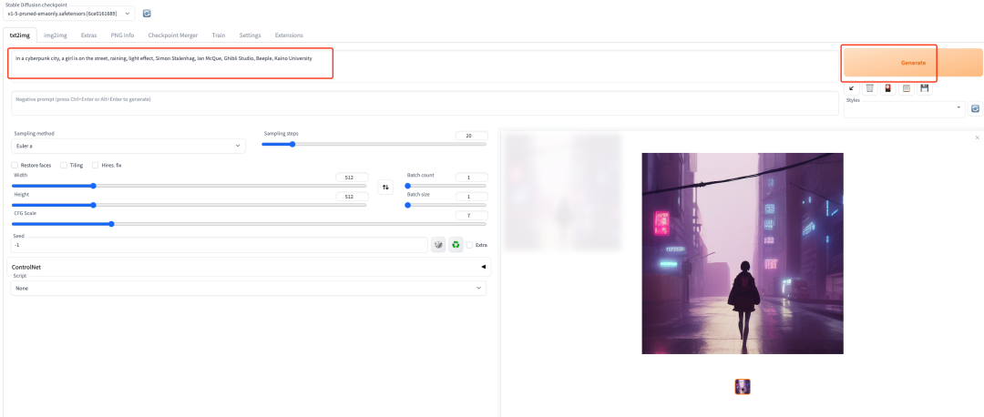在可用之后刷新刚刚那个页面就已经完成,你可以输入相应的提示语,点击生成,就会生成一张根据你提示语生成的图片,很快就完成了。