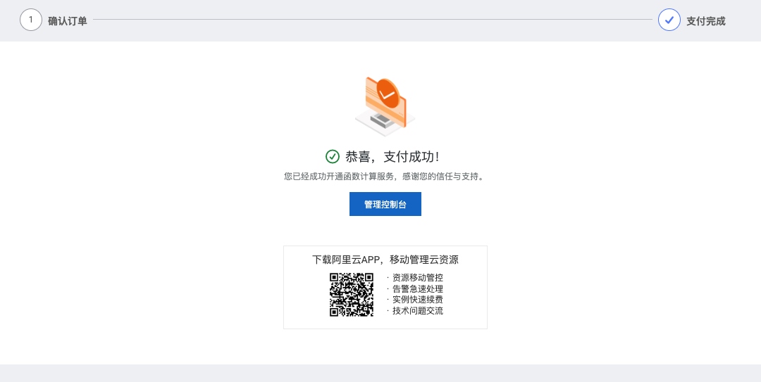 选择函数后直接购买支付,会自动减免,支付是0元,购买成功后可以看到有个管理控制台