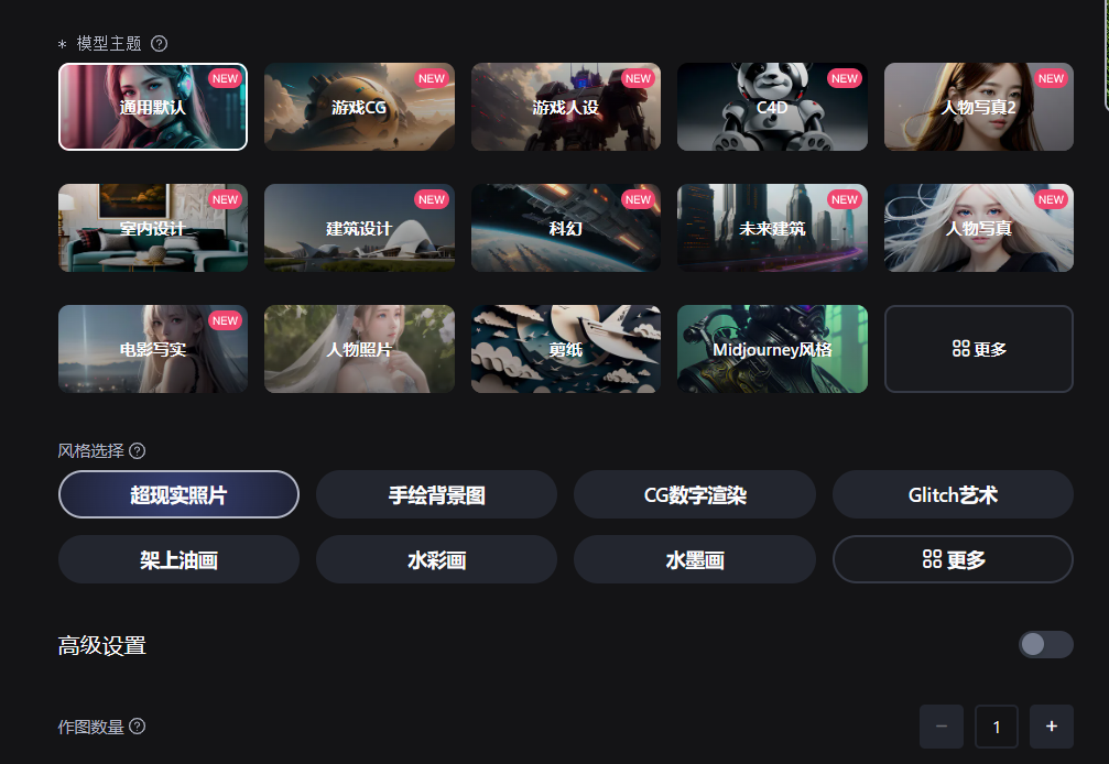 模型选择通用默认即可,风格选择超现实照片,当然这些可以根据你的喜好来自行选择,数量选择默认的1张图即可。