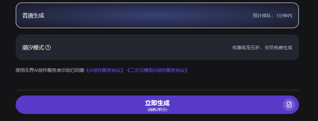 默认的普通模式,不用管,然后点击立即生成即可。