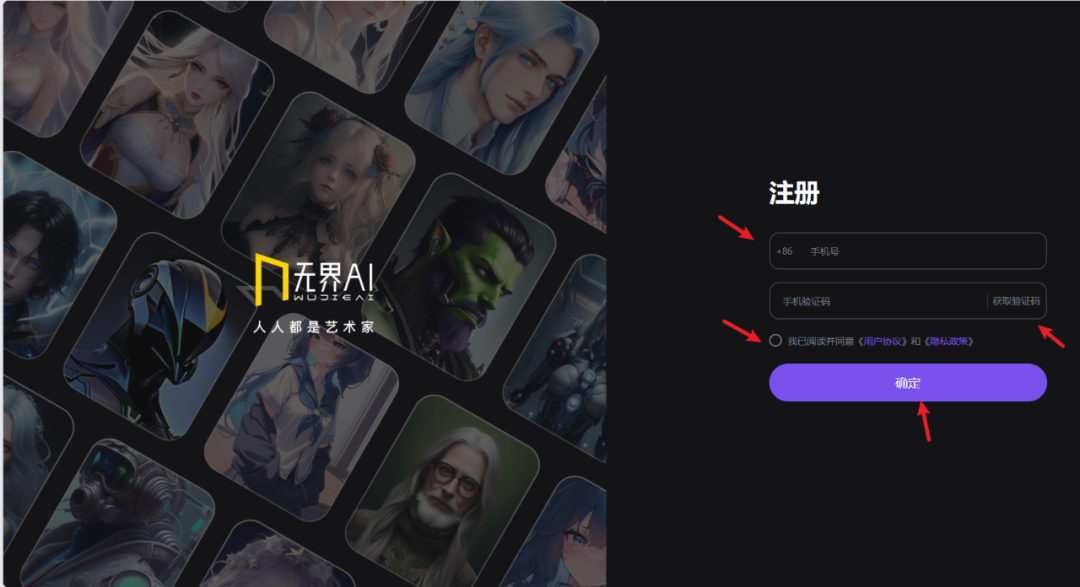 打开上面的注册链接,依次填入自己的手机号,发送验证码,输入验证码,同意协议的圆圈打上勾,然后确定即可。