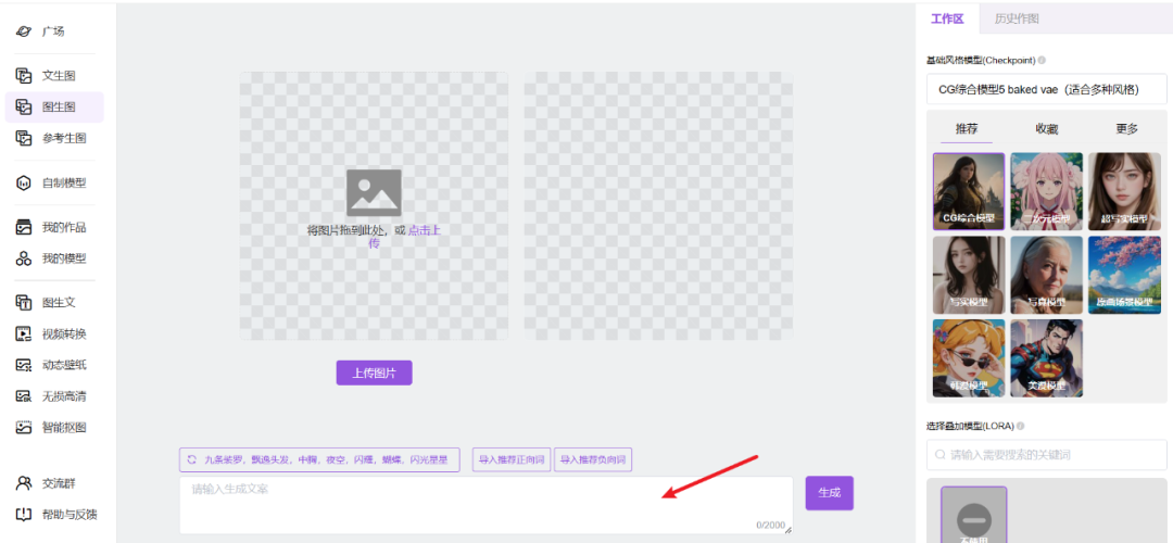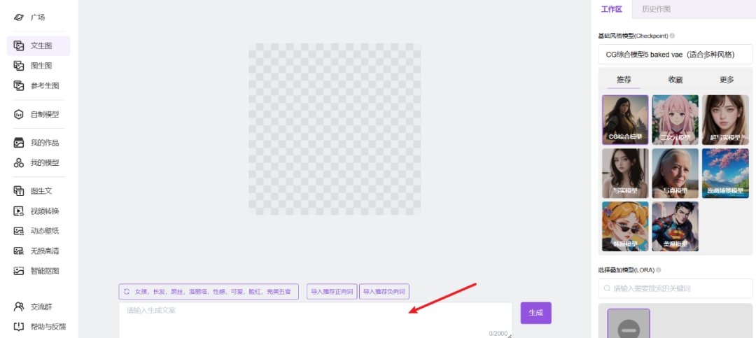 我们先选择文生图,最右侧是一些可以选择的模型,箭头所指的框内,输入你的提示词,然后点击生成即可。