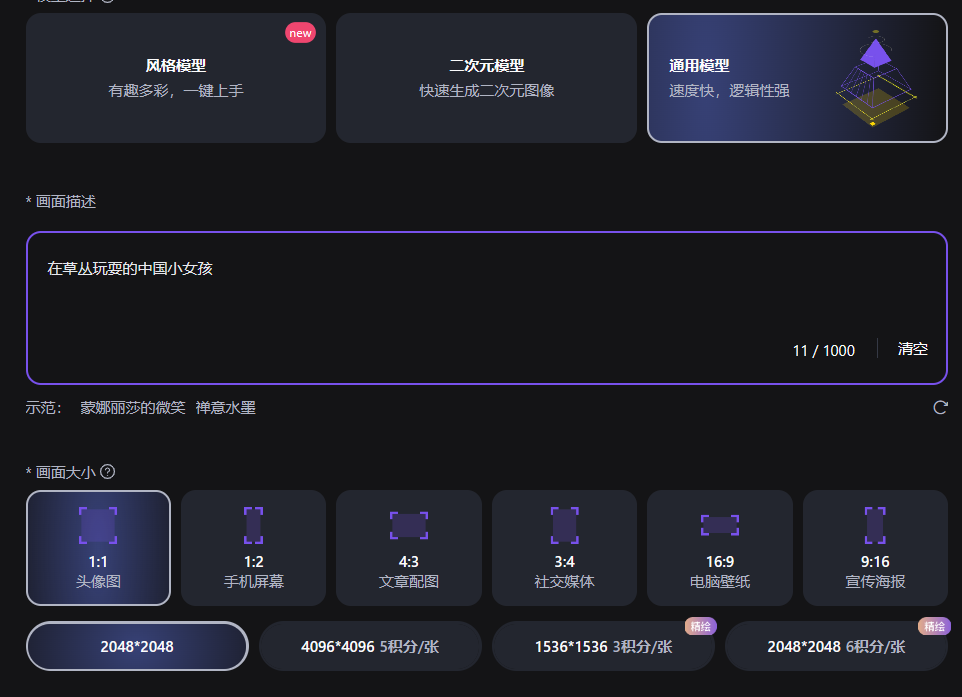 模型选择通用模型,画面描述输入你想生成图片的提示词。画面大小默认为头像大小,当然你可以根据需要,自行选择上面的尺寸大小。