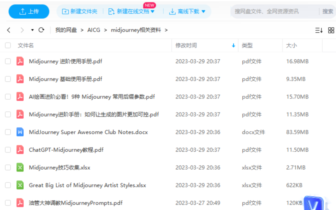 这里会保存我收集的各种关于AIGC的资源和资料,包括AI绘画-midjourney,ChatGPT, GPT-4,百度-文心一言的各种资料。会保持持续更新,欢迎大家自行拿取。(网盘地址和密码在知识星球自取!)