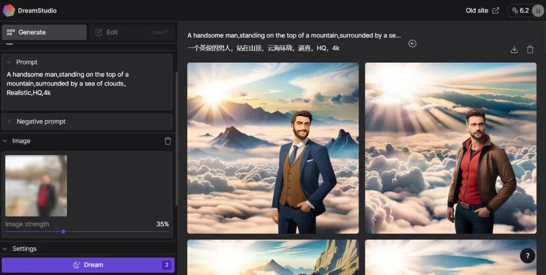 3.图生图操作:在左侧Prompt文本区:通过Upload image上传一张个人风景照,然后输入描述文本,然后点击Dream按钮,即可得到AI绘画作品,如图,生成图片人物姿势与上传图片和描述文本一致。