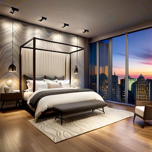 with four-poster bed, plush bedding, soft lighting, large windows with natural