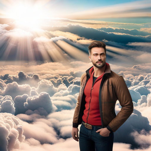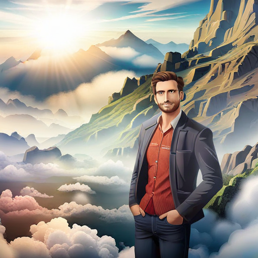 handsome man,standing on the top of a mountain,surrounded by a sea of clouds,Realistic,HQ,4k