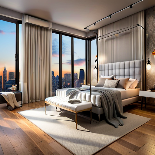 intimate and relaxing(舒适的卧室配有四柱床、毛绒床上用品、柔和的照明、带自然光的大窗户、个性壁纸、装饰抱枕、高分辨率纹理、亲密而放松)