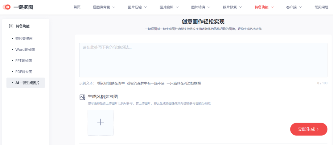 步骤二:在文本框输入描述的词语或句子,并上传一张参考图供AI系统参考,接着点击立即生成,就可以等待绘画作品生成了。
