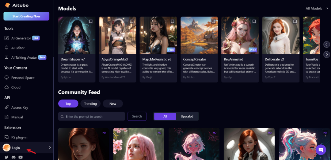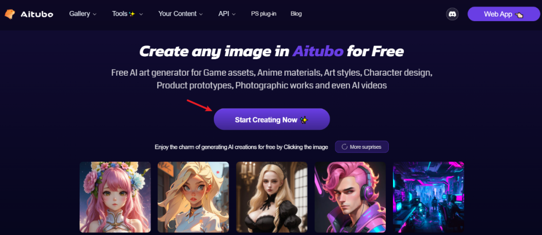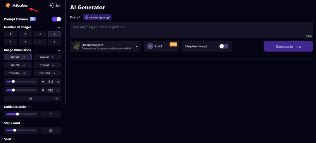 点击开始创作之后,来到上图的界面,点击箭头所指的Aitubo图标。
