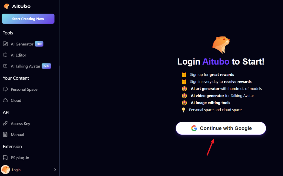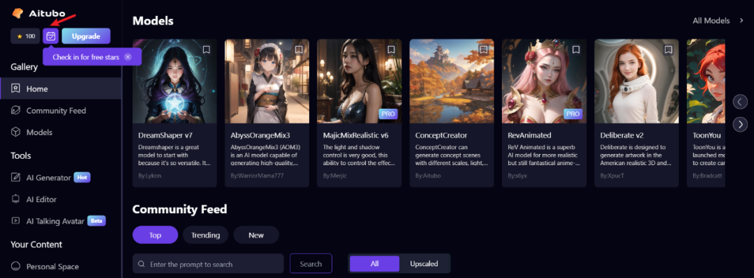 经过上述操作之后,会自动登录网站。网站支持每天签到获得积分,积分可用于出图。
