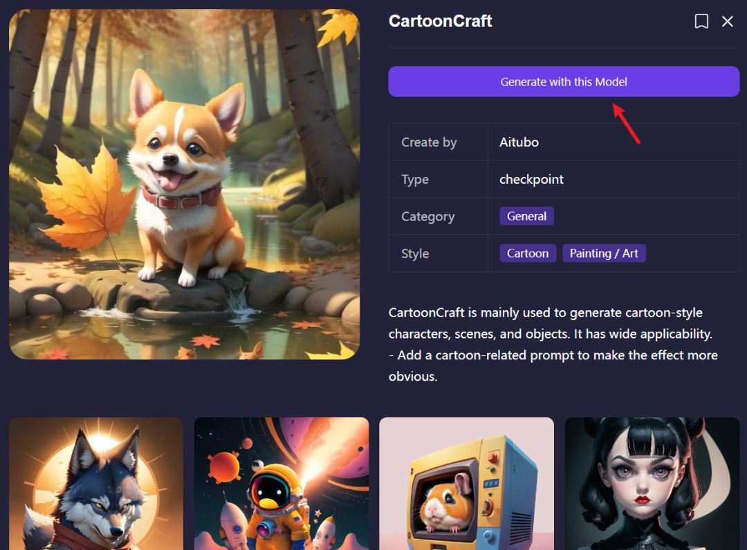 然后会看到对这个模型的介绍,以及下方会有一些这个模型生成的好看图片。点击红色箭头所指蓝色框,用这个模型创作。