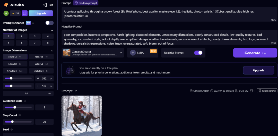 在上方输入指令词,选择自己想要的模型,然后点击generate即可,上图是我选择随机生成的指令,然后生成的图片,效果还可以。