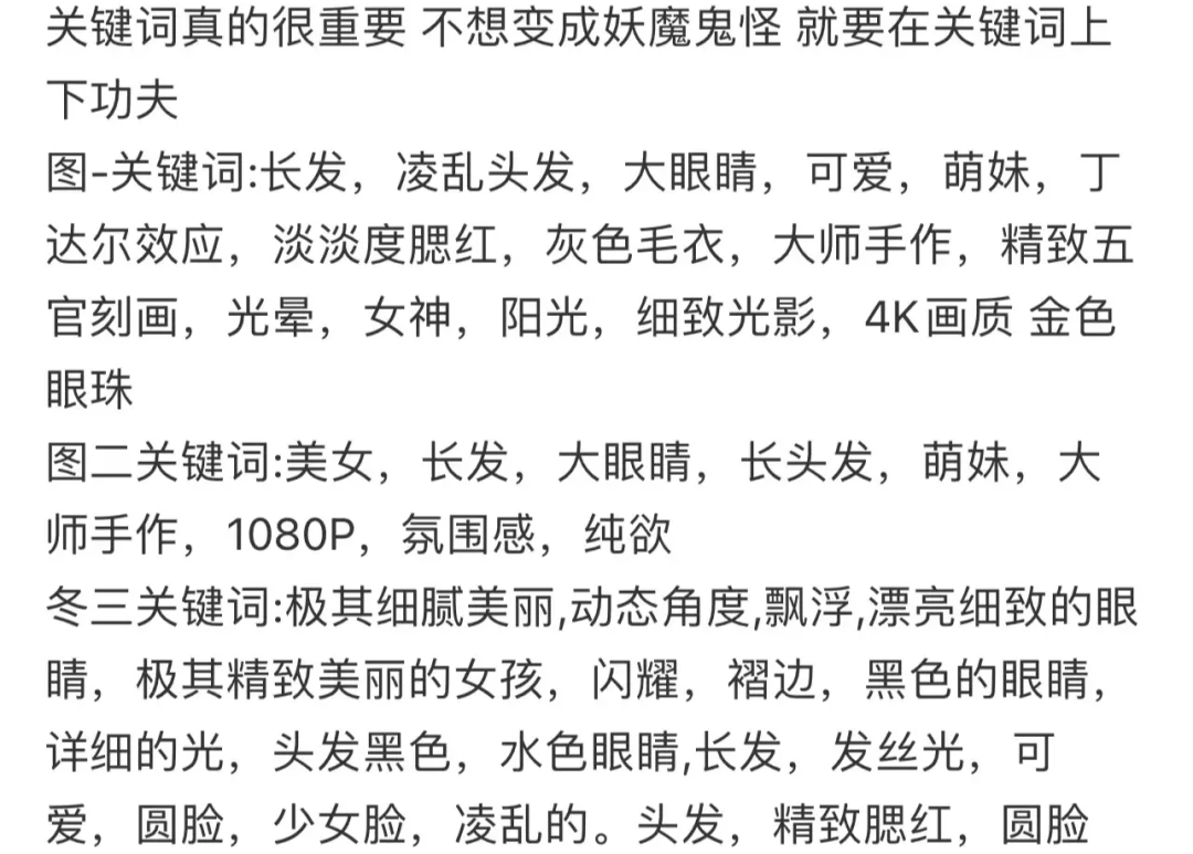 但由于AI绘图存在不稳定性,前方等待你的将是一个个待拆的盲盒(如前文所示)。如果想要尽可能驯服AI,那么需要在第二步设置详尽到头发丝的关键词。