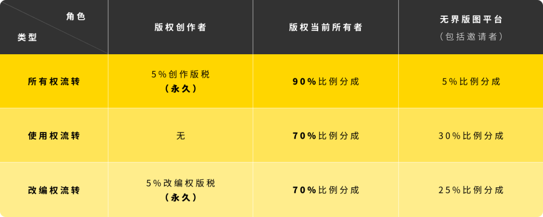 与此同时,无界版图还支持原创作品的数字版权在平台内交易流转,平台会从中抽取5%~30%的手续费或分成。